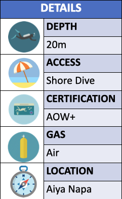 The site is situated on the far east of the island along the Cape Greko peninsula. The site is characterised by crystal clear waters and a shallow sandy bottomed floor at around 12m which is perfect for beginners.