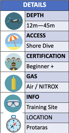 The site has something to offer divers of varying experiences. In the shallows it has stunning topography of huge boulders, rocks, seagrass and sand – including a sandy, uphill path between meadows of Posidonia seagrass. Whilst if you follow the “Ski Jump”, this gradual slope will take you down past 40m.