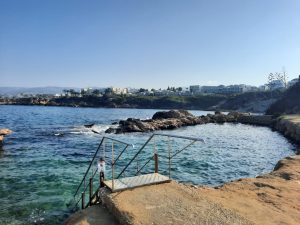 Cynthiana Beach has two access points. First is has a natural shallow pool which is ideal for practising skills with the sea being access by finning over a small gap in the rocks. Alternatively the sea can be directly accessed by ladder into a small bay that is popular with snorkelers and swimmers.