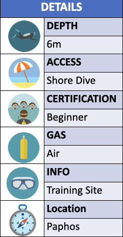 Timi Beach is an excellent site for training and beginner divers. It is Situated next to Paphos Airport in a sheltered bay, making it accessible in all but the windiest of conditions.