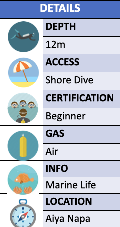 The site is situated on the far east of the island along the Cape Greko peninsula. The site is characterised by crystal clear waters and a shallow sandy bottomed floor at around 12m which is perfect for beginners.